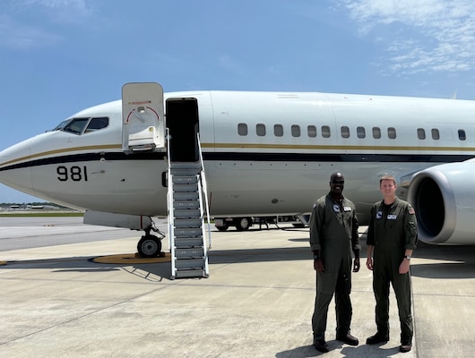 Navy Reserve pilots Lt. Cmdr. Mike Carr and Lt. Cmdr. Diego McKnight operated the C-40 along with two active duty aircrew personnel, escorting the Sea Cadet group on a regularly scheduled training flight from Ft. Worth to Pensacola.