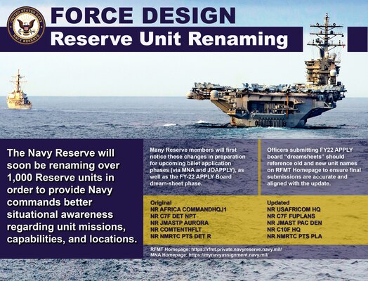 Many Reserve members will first notice these changes in preparation for upcoming billet application phases (via MNA and JOAPPLY), as well as the FY-22 APPLY Board dream-sheet phase. To support these application phases/processes, a list of old and new unit names can be found on the N1 Share-point page at: